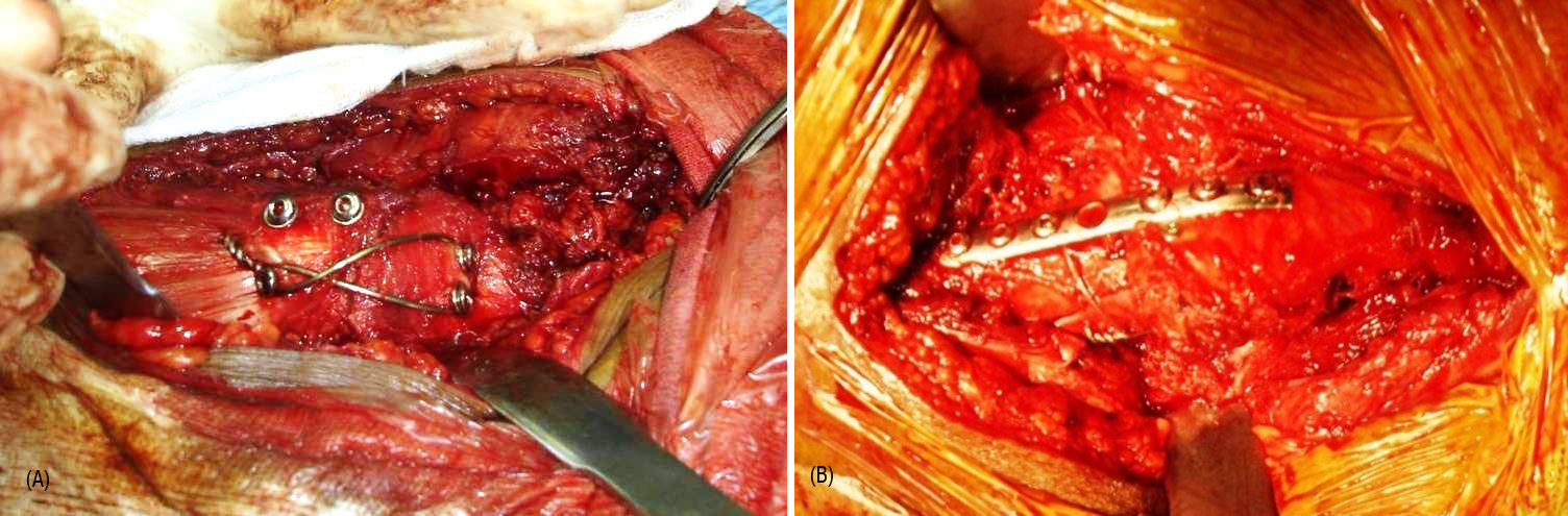 Figure 3: Trochanter reconstruction (A) Tension band, (B) Plating.