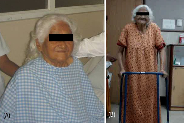 Figure 6: (A) Patient sitting on 1st post operative day. (B) Patient walk with walking aid after 2 weeks post operative.