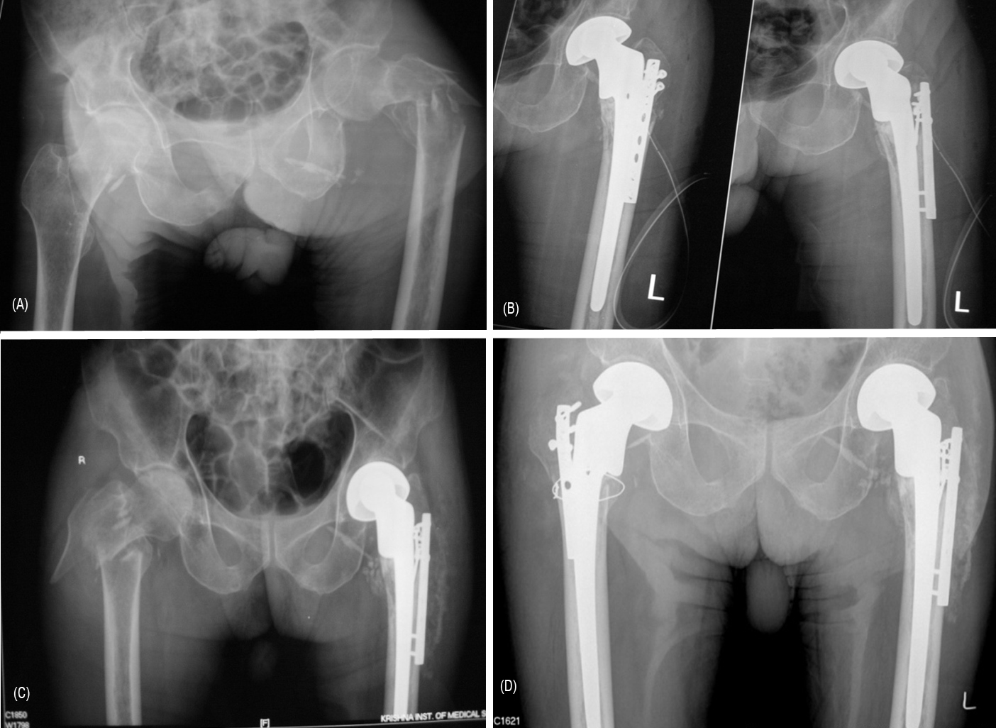 Figure 7: (A) comminuted IT fracture of the left femur, (B) Postoperative radiograph, (C) Similar IT fracture of right femur 4 months later, (D) Similar reconstruction postoperative radiograph.