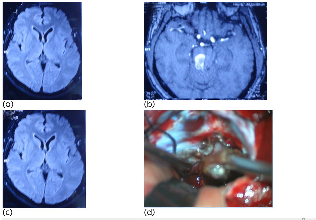 Figure 1a,b,c: (a-c) Axial MR image showing a cavernous malformation of the pons after the first haemorrhage, (d) Intraoperative photograph: After exposure the bulging aspect of the right lateral pons and subpial hemosiderin staining is visible.