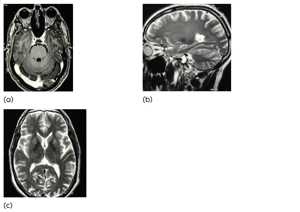 Figure 2a,b,c: (a-c) Axial & Sagital MR image showing an acute pontine haemorrhage.